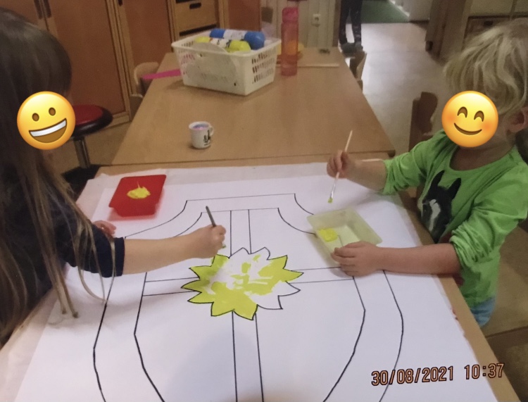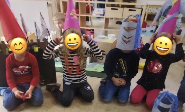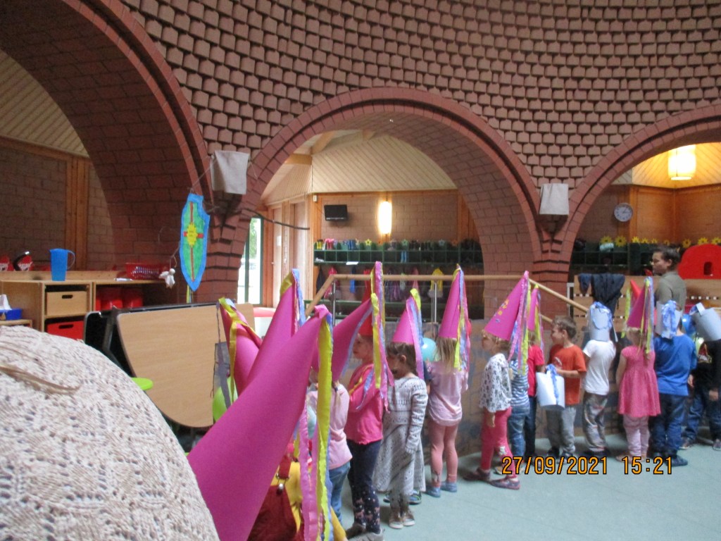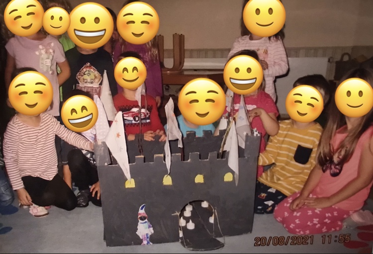 Zusätzlich diente eine selbstgebastelte Burg den Kindern als anschaulicher Einstieg für das damalige Leben. Hierbei kam es schnell zu einem intensiven Austausch in den Morgenkreisen unter den Kindern, wo sie auch ihr Vorwissen mit einbrachten. Die Kinder lernten in diesem Zeitraum alles über die Burg, über das Leben auf einer Burg, über die Ritter und die Prinzessinnen durch unterschiedliche Kreativaktionen kennen. Der krönende Abschluss dieser Zeitreise war dann unser Ritterfest, wo wir als Gruppe mit viel Freude und Spaß hingearbeitet haben. An diesem Tag luden wir die Eltern ein, um mit uns zu feiern und unsere Ritterfestspiele zu bestaunen. Ein großes Dankeschön geht auch hier noch einmal an die Eltern raus, für die tolle Unterstützung.