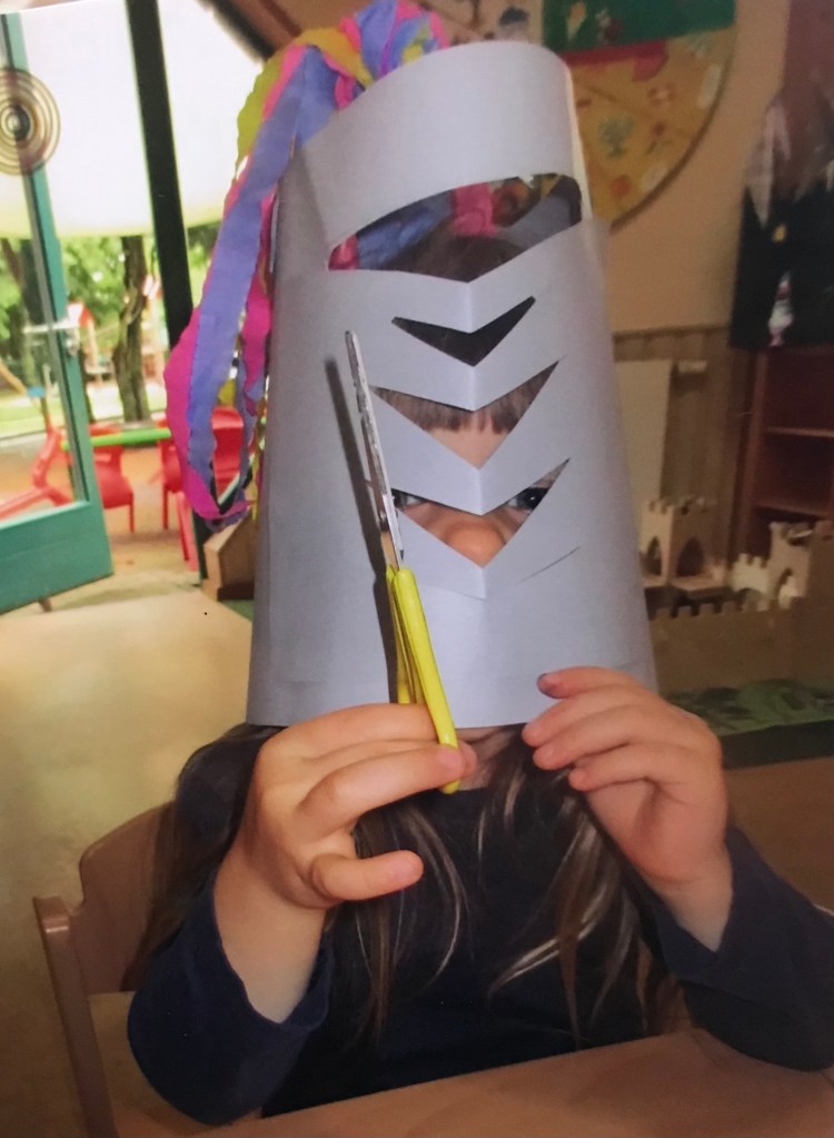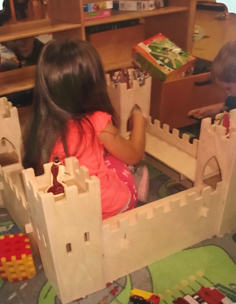 Eine wunderschöne Ritterburg aus Holz zog bei uns in der Sonnengruppe ein. Großes Interesse bei den Kindern wurde geweckt, nicht nur die Jungen, auch die Mädchen saßen mittendrin und hatten viel Spaß beim Bespielen der Burg. Von da an entstand unser Projekt „Ritter und Burgen“. Dieses Thema begleitete uns mehrere Wochen lang und hat uns in allen Bildungsbereichen im Kindergarten geführt.