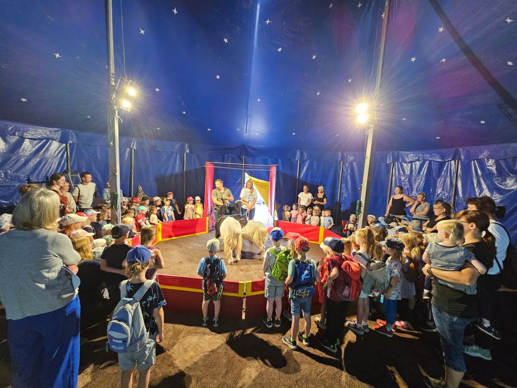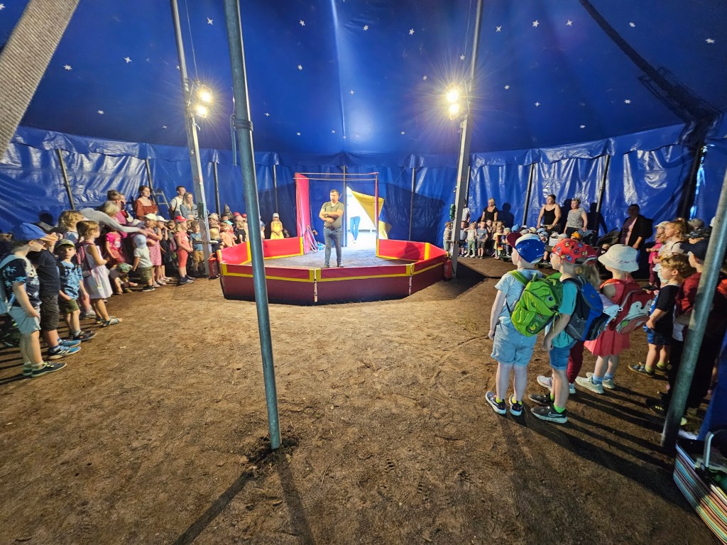 Vom 24.06.2024 – 28.06.2024 fand unsere aufregende Projektwoche “ Zirkus im Kindergarten“ statt. Die Kinder hatten die gesamte Woche über die Möglichkeit, in die faszinierende Welt des Zirkus einzutauchen und verschiedene Rollen einzunehmen. Am Freitag, den 28.06.2024 war es dann endlich soweit: Der große Auftritt im Zirkuszelt stand bevor! Die Nestkinder verwandelten sich in mutige kleine Löwen, die mit viel Geschick durch Reifen sprangen. Ihre Freude und ihr Mut begeisterten alle Zuschauer. Die anderen Kinder der Kita schlüpften in verschiedene Rollen und präsentierten eine bunte Mischung aus Cowboys, Clowns, Ziegenbändigern, Hundedompteuren und Laufentenfreunden. Sogar ein Taubendressur und Tellerjongleure war teil des Programms!
