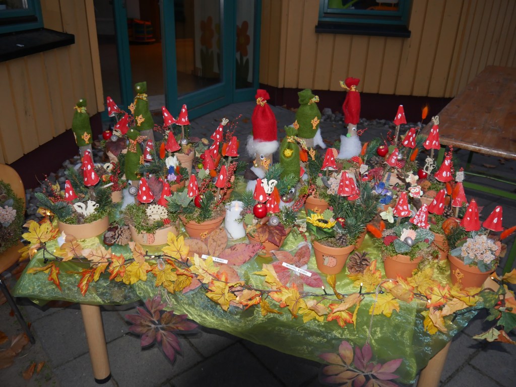 Für das leibliche Wohl war bestens gesorgt: Köstliche Brezeln, würzige Bratwurst, herzhafte Schmalzstullen sowie warmer Kinderpunsch und duftender Glühwein machten den Abend zu einem kulinarischen Erlebnis. Ein besonderes Highlight war der Verkauf der von den Kindern gebastelten Herbstgestecke und Holzmännchen. Diese kreativen Werke spiegelten die Fantasie und den Fleiß der kleinen Künstler wieder und erfreuten sich großer Beliebtheit. Viele Besucher kauften Gestecke, um sich ein Stück der herbstlichen Stimmung nach Hause zu holen und gleichzeitig die Kinder zu unterstützen.