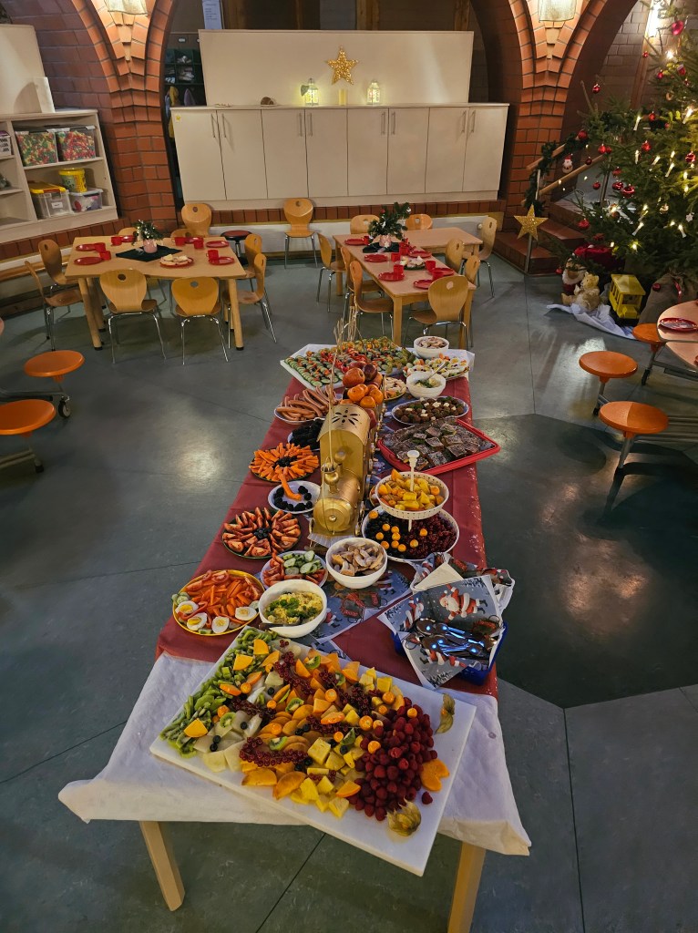 Am 19. Dezember 2024 fand unsere Kinderweihnachtsfeier statt. Sie begann mit einem gemeinsamen Frühstück, das die ErzieherInnen liebevoll vorbereiteten. Die strahlenden Kinder waren unsere größte Freude. Im Anschluss besuchte der Weihnachtsmann mit seinem Engel die Kinder. Sie sangen, trugen Gedichte vor und überreichten ihm selbst gemalte Bilder. Der Weihnachtsmann brachte Geschenke für die Kita und verabschiedete sich dann. Die Kinder feierten in ihren Gruppen weiter und hatten viel Spaß.