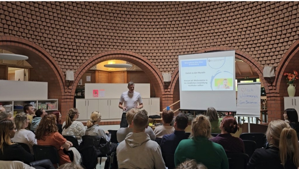 Am vergangenen Dienstag, den 07 10.2025 fand der Infonachmittag im Kindergarten Eden statt. Unter dem Titel „Zurück zu den Wurzeln – Die Bedeutung der kindlichen Meilensteine“ gab Dozent Sven Bresemann einen verständlichen Einblick in zentrale Entwicklungsmeilensteine sowie mögliche Abweichungen. Die Veranstaltung war gut besucht; zahlreiche Eltern nutzten die Gelegenheit, sich über praxisnahe Fördermöglichkeiten im Kindergartenalltag zu informieren und sich mit Fachkräften sowie anderen Eltern auszutauschen. Eine zentrale Erkenntnis war, dass verpasste Meilensteine nachgeholt werden können und so das Gleichgewicht der Kinder wiederhergestellt wird. I Wir danken allen Teilnehmenden für das große Interesse und den konstruktiven Austausch.