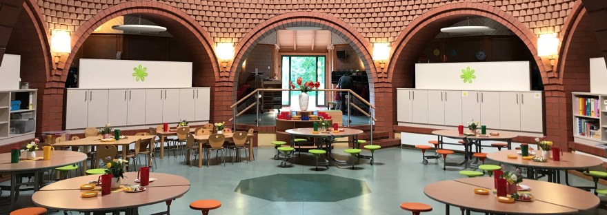 Unser Kuppelsaal, als Mittelpunkt unseres Kindergartens, wurde Ende 2021 umgebaut. Seitdem bietet er uns täglich einen gemeinschaftlichen Treffpunkt zum Einnehmen der Mahlzeiten.Außerhalb der Essenszeiten dient er als Multifunktionsraum u.a. für Angebote, kleine Feste, Gruppenfeiern, Geburtstage Elternabende und andere Höhepunkte.Wir freuen uns sehr über die neuen Möglichkeiten, die uns der Umbau ermöglicht hat.